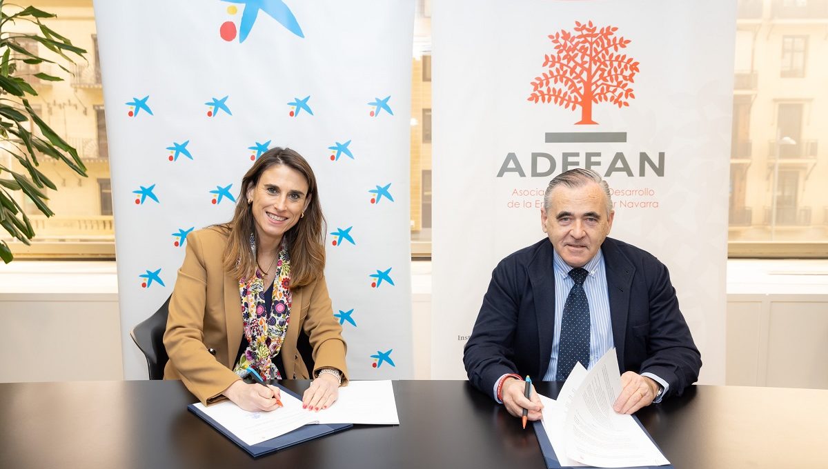 La Asociación para el Desarrollo de la Empresa Familiar Navarra (ADEFAN) y CaixaBank Dualiza organizan la tercera edición del programa “Empresa Familiar en las Aulas” destinada a acercar el mundo de la empresa a los estudiantes. Así quedó reflejado en el convenio que servirá de marco para impulsar este programa educativo suscrito el 28 de marzo por el presidente de ADEFAN, Francisco Esparza y la directora territorial Ebro de CaixaBank, Isabel Moreno. A la firma también acudió Marisa Sáinz, la directora de la asociación; Cristina Rodríguez, coordinadora territorial de la Zona Norte de CaixaBank Dualiza; así como Carlos Sánchez Mitelbrum, director de Banca de Empresas de la territorial Ebro de CaixaBank.