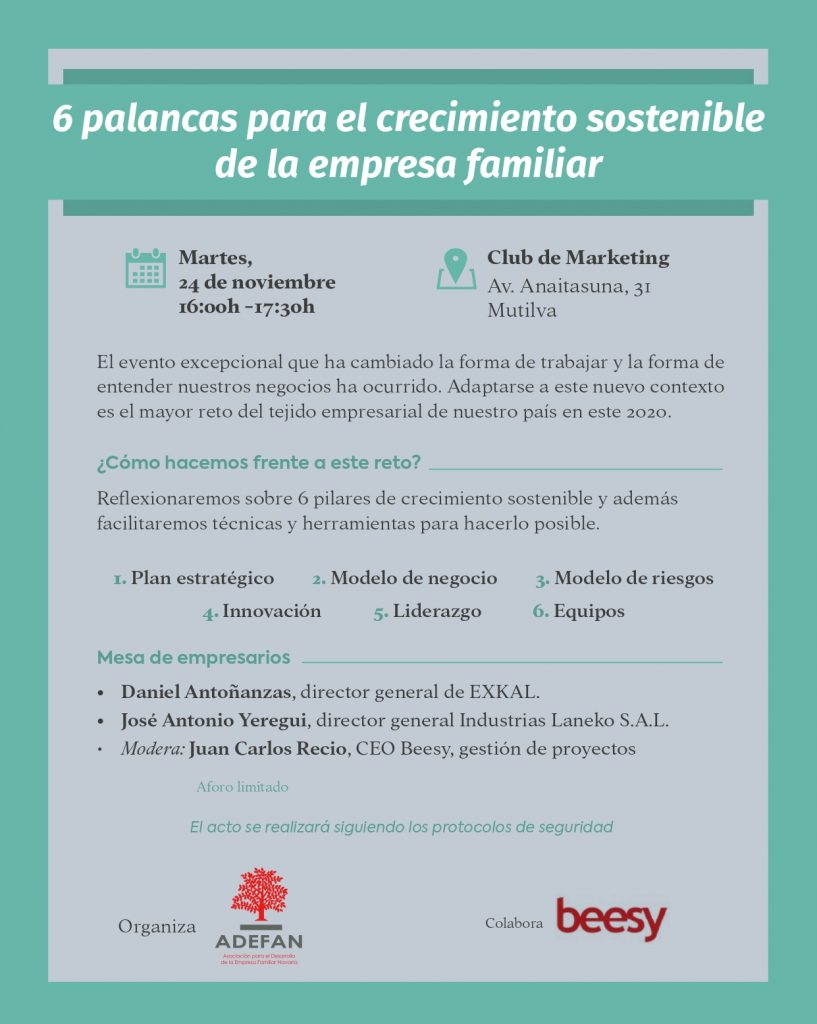 En este encuentro reflexionaremos sobre los 6 pilares de crecimiento sostenible de las empresas (Estrategia, Modelo de Negocio, Modelo de Riesgos, Innovación, Liderazgo y Equipos) y, además, facilitaremos técnicas y herramientas para hacerlo posible