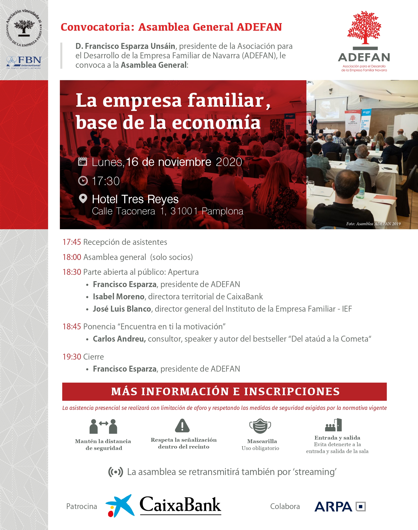 La asistencia presencial se realizará con limitación de aforo y respetando las medidas de seguridad exigidas por la normativa vigente.
