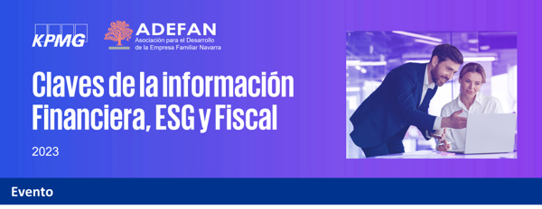 Sesión de actualización normativa «Claves de la Información Financiera, ESG y Fiscal 2023» organizada por KPMG, en colaboración con ADEFAN, que se celebrará de forma presencial el próximo 13 de diciembre a las 16:30 en Hotel Iruña Park Pamplona (Arcadio M. Larraona 1, Pamplona)