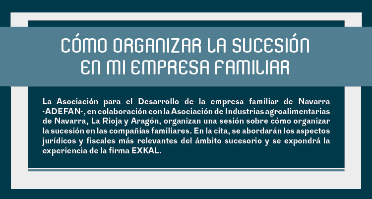 La Asociación para el Desarrollo de la empresa familiar de Navarra -ADEFAN- ,en colaboración con la Asociación de Industrias agroalimentarias de Navarra, La Rioja y Aragón, organizan una sesión sobre cómo organizar la sucesión en las compañías familiares. En la cita, se abordarán los aspectos jurídicos y fiscales más relevantes del ámbito sucesorio y se expondrá el caso práctico de la firma EXKAL.