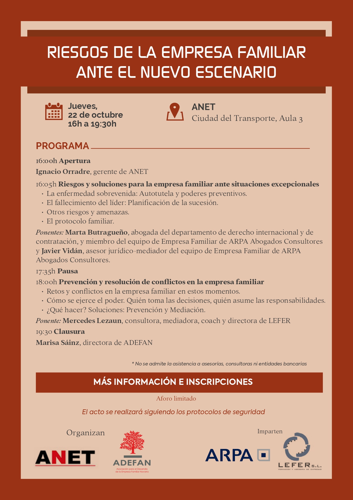 Ponentes: Marta Butragueño, abogada del departamento de derecho internacional y de contratación, y miembro del equipo de Empresa Familiar de ARPA Abogados Consultores y Javier Vidán, asesor jurídico-mediador del equipo de Empresa Familiar de ARPA Abogados Consultores.