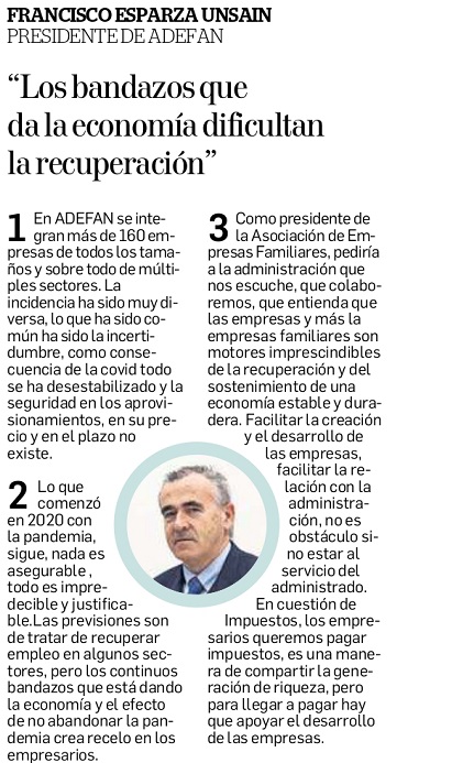 El presidente de la Asociación para el Desarrollo de la Empresa Familiar Navarra (ADEFAN), Francisco Esparza, fue uno de los 120 protagonistas empresariales de la Comunidad foral que Diario de Navarra entrevistó dentro de su especial «Expectativas 2022» publicado el 31 de diciembre pasado.