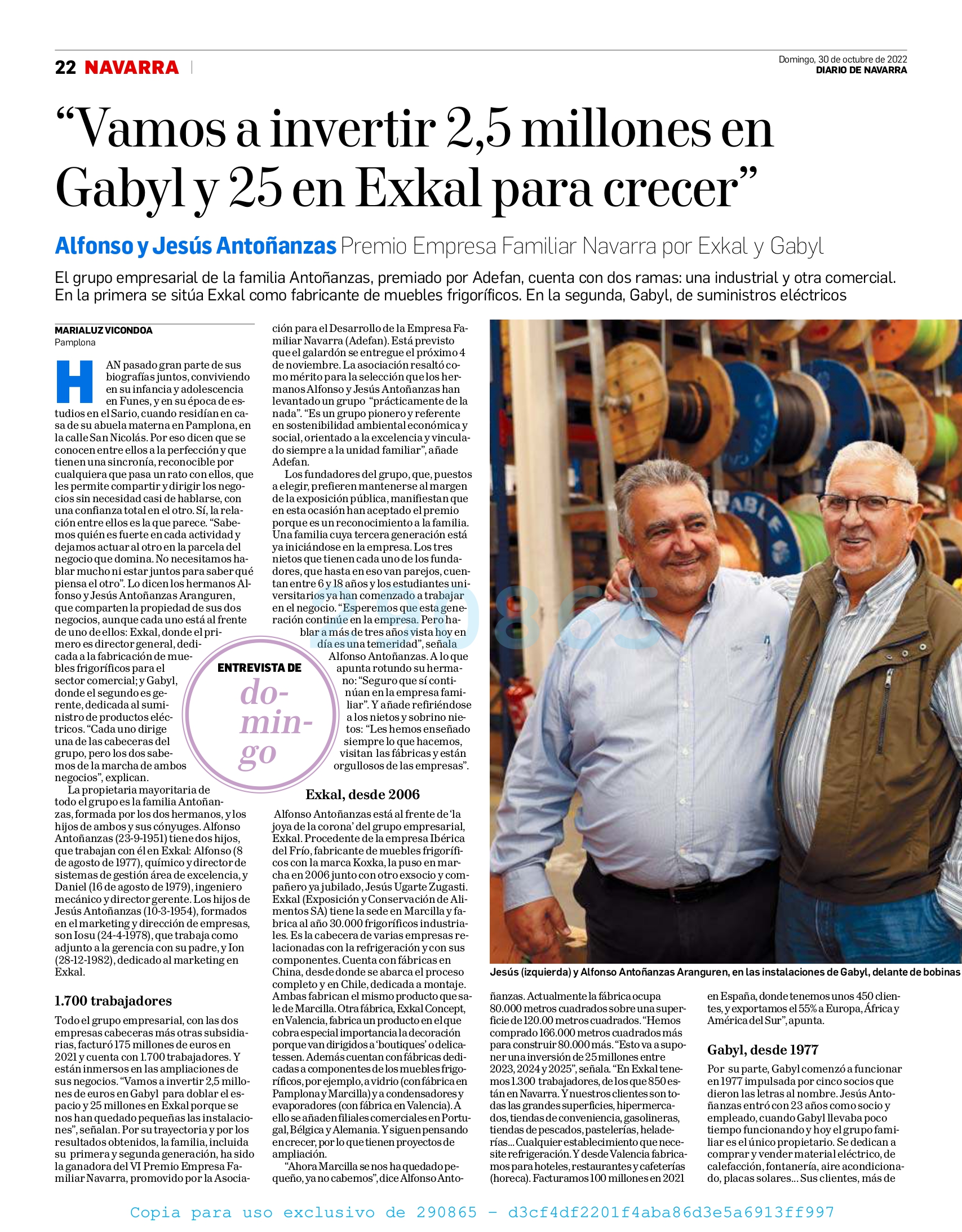 En dicha publicación, Jesús y Alfonso avanzan algunos de los planes de futuro de una corporación que emplea a 1.700 personas y que tiene como principales referencias a las firmas Gabyl Suministros Eléctricos y Exkal. Precisamente, la primera recibirá una inyección económica de 2,5 millones de euros mientras que a la segunda se destinará una inversión de 25 millones. En ambos casos, el objetivo es impulsar su crecimiento y consolidación.