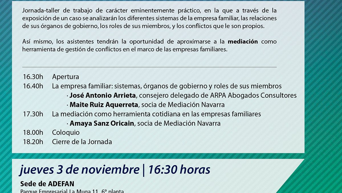 Así mismo, los asistentes tendrán la oportunidad de aproximarse a la mediación como herramienta de gestión de conflictos en el marco de las empresas familiares.