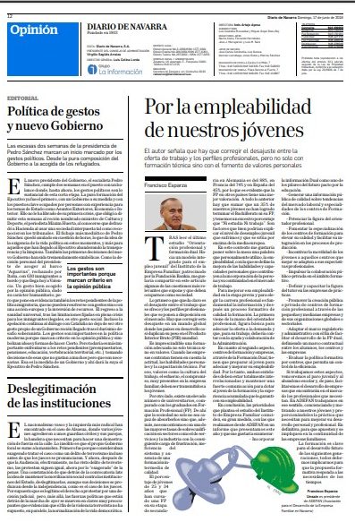 El presidente de ADEFAN, Pachi Esparza, publicó el 17 de junio una tribuna de opinión en el Diario de Navarra en la que defendió la importancia de corregir el desajuste entre la oferta de trabajo y los perfiles profesionales, con formación técnica y también el fomento de valores personales.