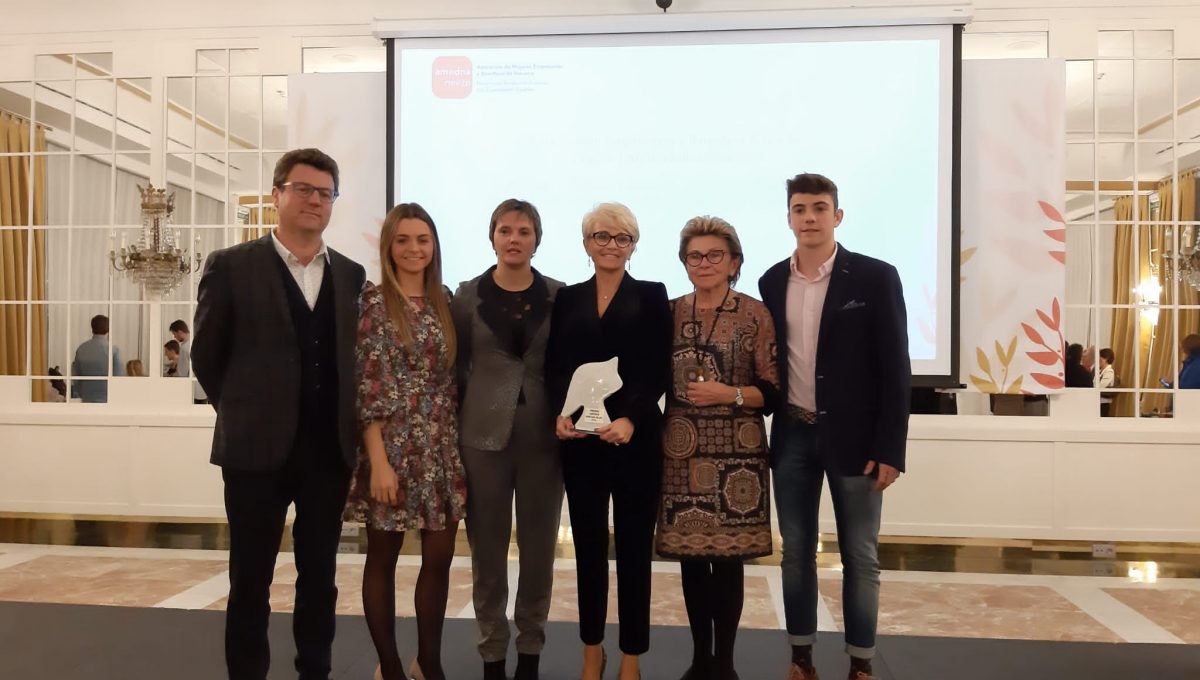 Nuestra asociada, Silvia Ezquerra, posa con el premio Empresaria Navarra 2019 concedido por AMEDNA acompañada por sus familiares.