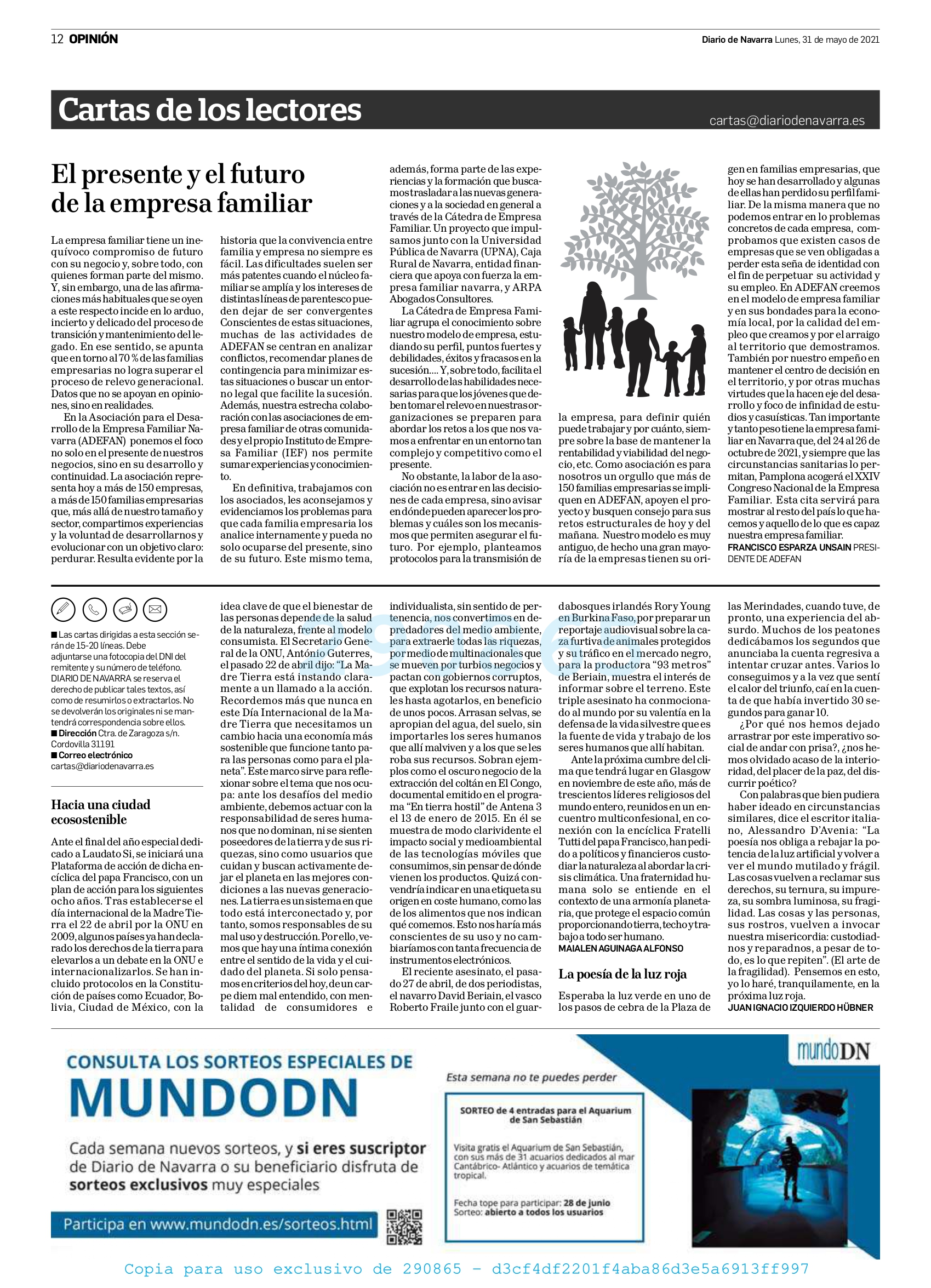 El presidente de la Asociación para el Desarrollo de la Empresa Familiar Navarra (ADEFAN), Francisco Esparza, firma este 31 de mayo una tribuna de opinión en Diario de Navarra bajo el título: «El presente y el futuro de la empresa familiar».