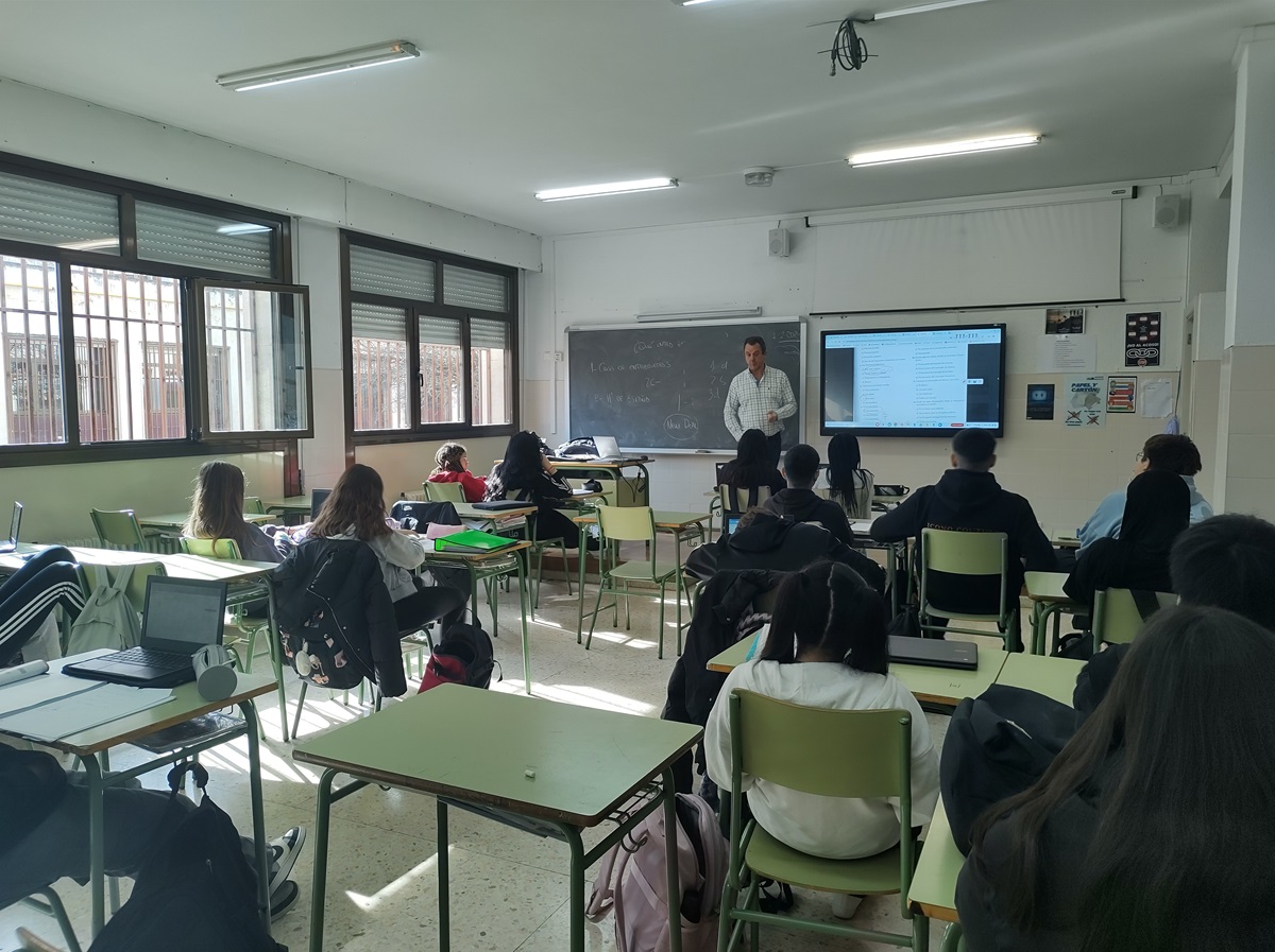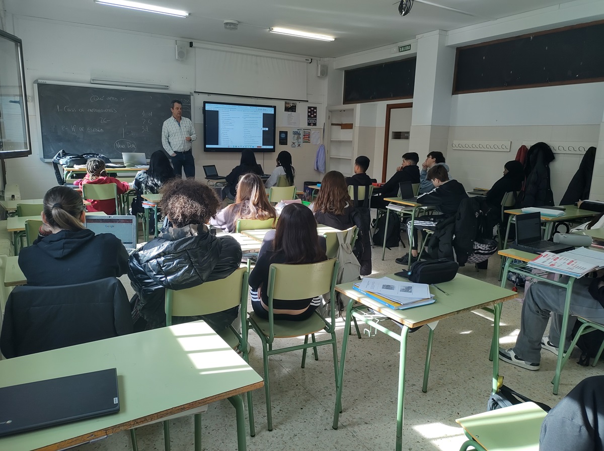 Un momento de la presentación de Javier Carmona (Grupo Jacar) a los alumnos de 4º ESO de IES Padre Moret-Irubide. (Fotos: cedidas).