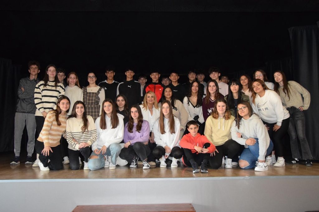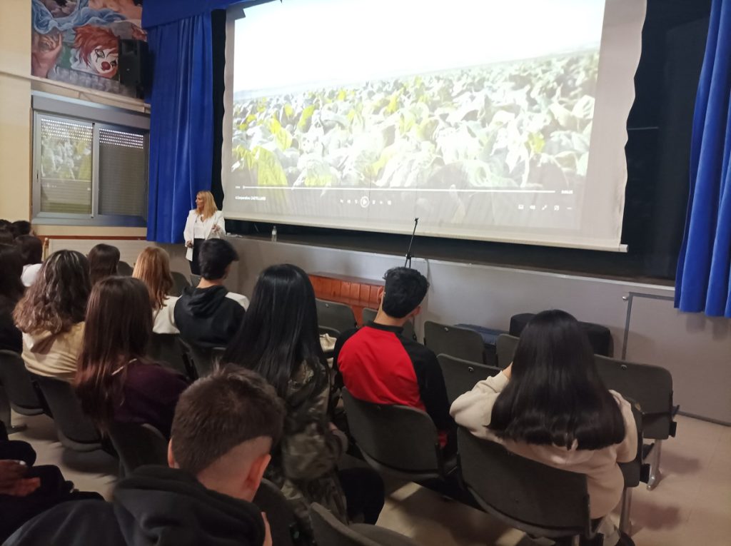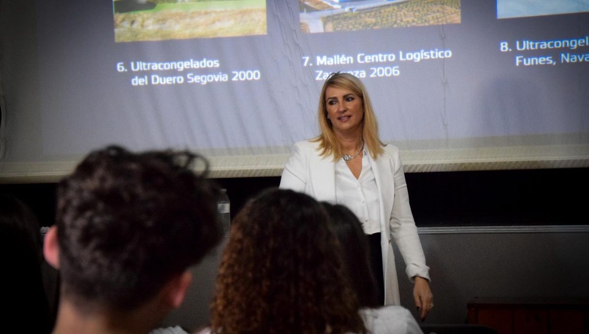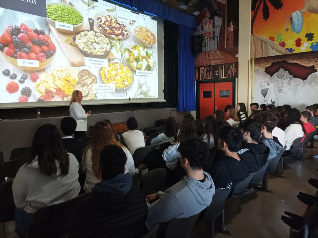 Un momento de la intervención de Marta Virto ante los alumnos del IES Reyno de Navarra, de Azagra. (Fotos: cedidas).