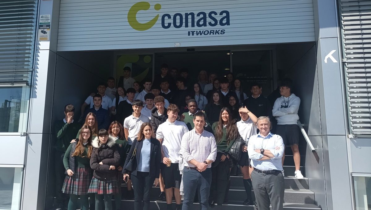 Foto de familia de los responsables de Conasa con los alumnos del Colegio Jesuitinas de Pamplona finalizada la visita a las instalaciones de la citada empresa familiar. (Fotos: cedidas).